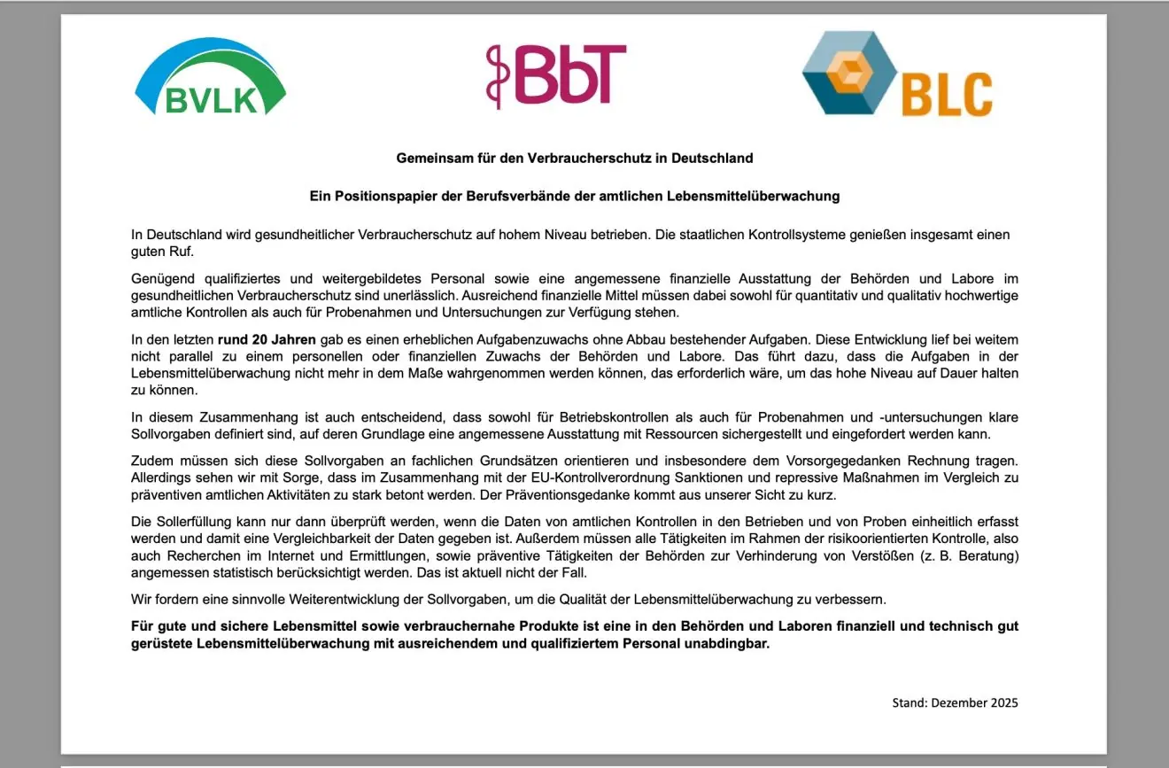 Positionspapier des Bundesverbandes zum Aufgabenzuwachs in der Lebensmittelüberwachung